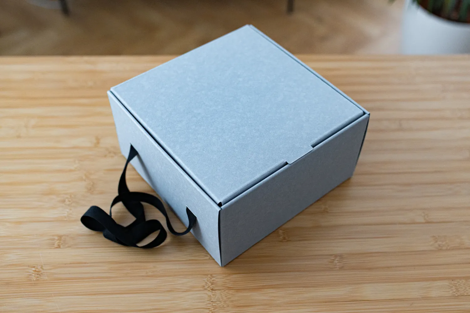 Upominek zapakowaliśmy w pudełko prezentowe wykonane z szarej tektury barwionej w masie, wykonanej z makulatury.