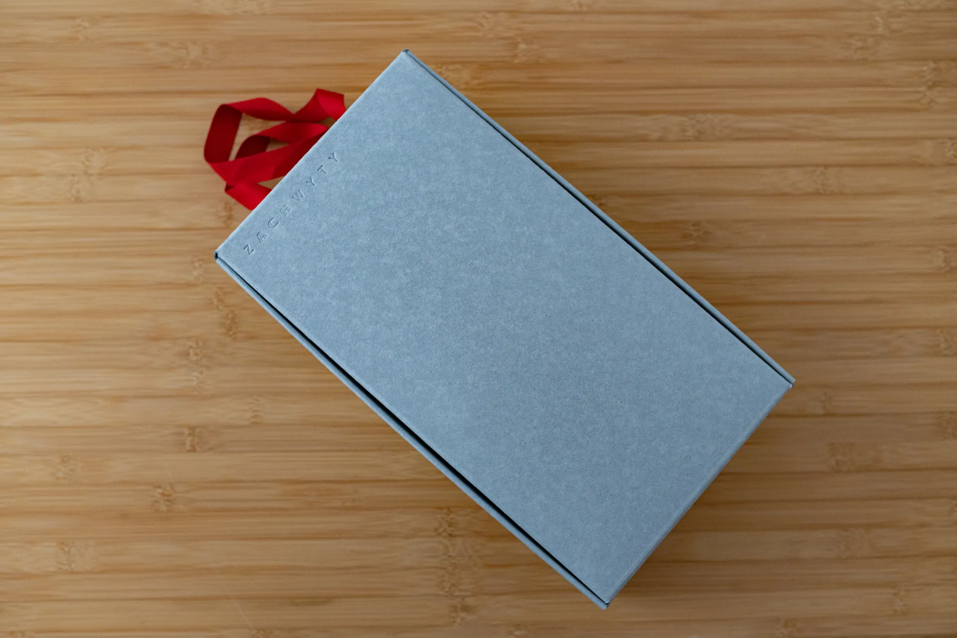 Upominek zapakowaliśmy w pudełko prezentowe wykonane z szarej tektury barwionej w masie, wykonanej z makulatury.