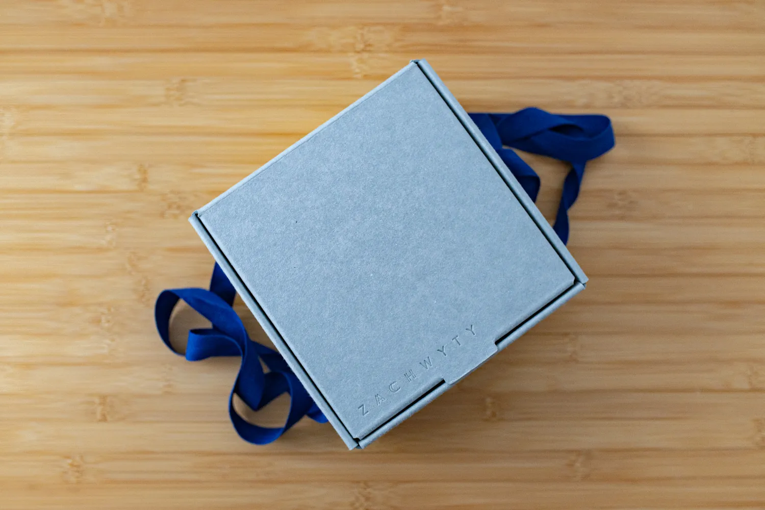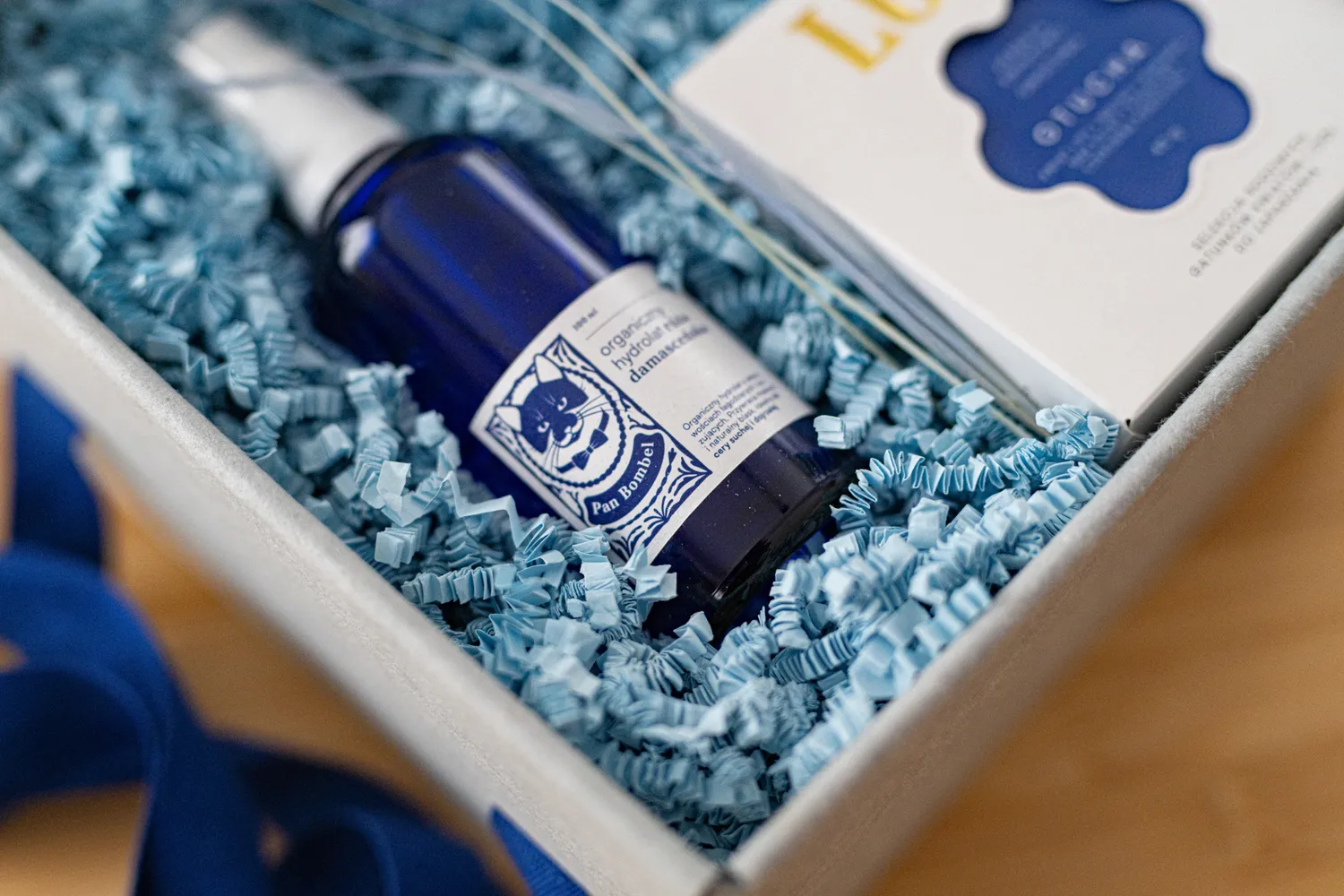 Nasze pudełko na wieku ma wytłoczony napis Zachwyty (które, mamy nadzieję, będą towarzyszyć przy wręczaniu tego upominku!) oraz granatowe uchwyty do przenoszenia – dzięki temu funkcjonalnemu rozwiązaniu nie potrzebujesz dodatkowych toreb prezentowych.