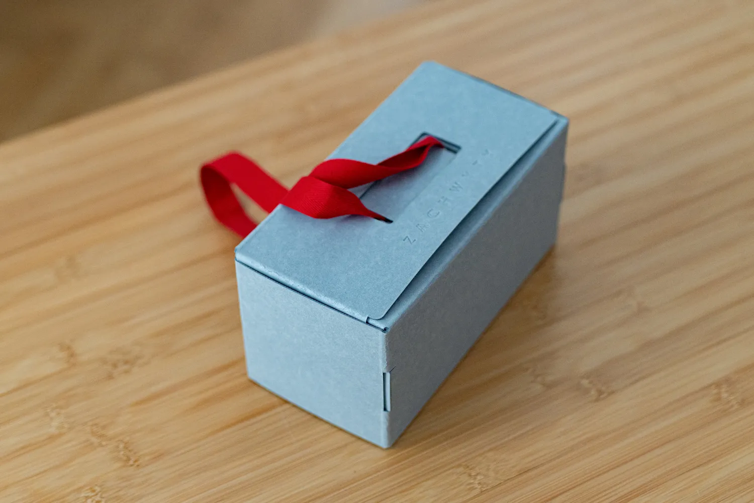 Upominek zapakowaliśmy w pudełko prezentowe wykonane z szarej tektury barwionej w masie, wykonanej z makulatury.