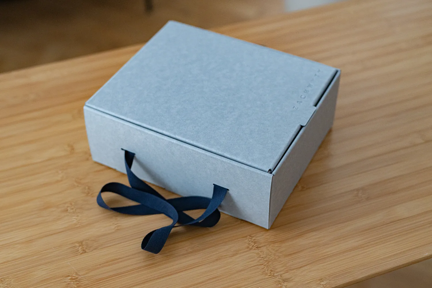 Upominek zapakowaliśmy w pudełko prezentowe wykonane z szarej tektury barwionej w masie, wykonanej z makulatury.