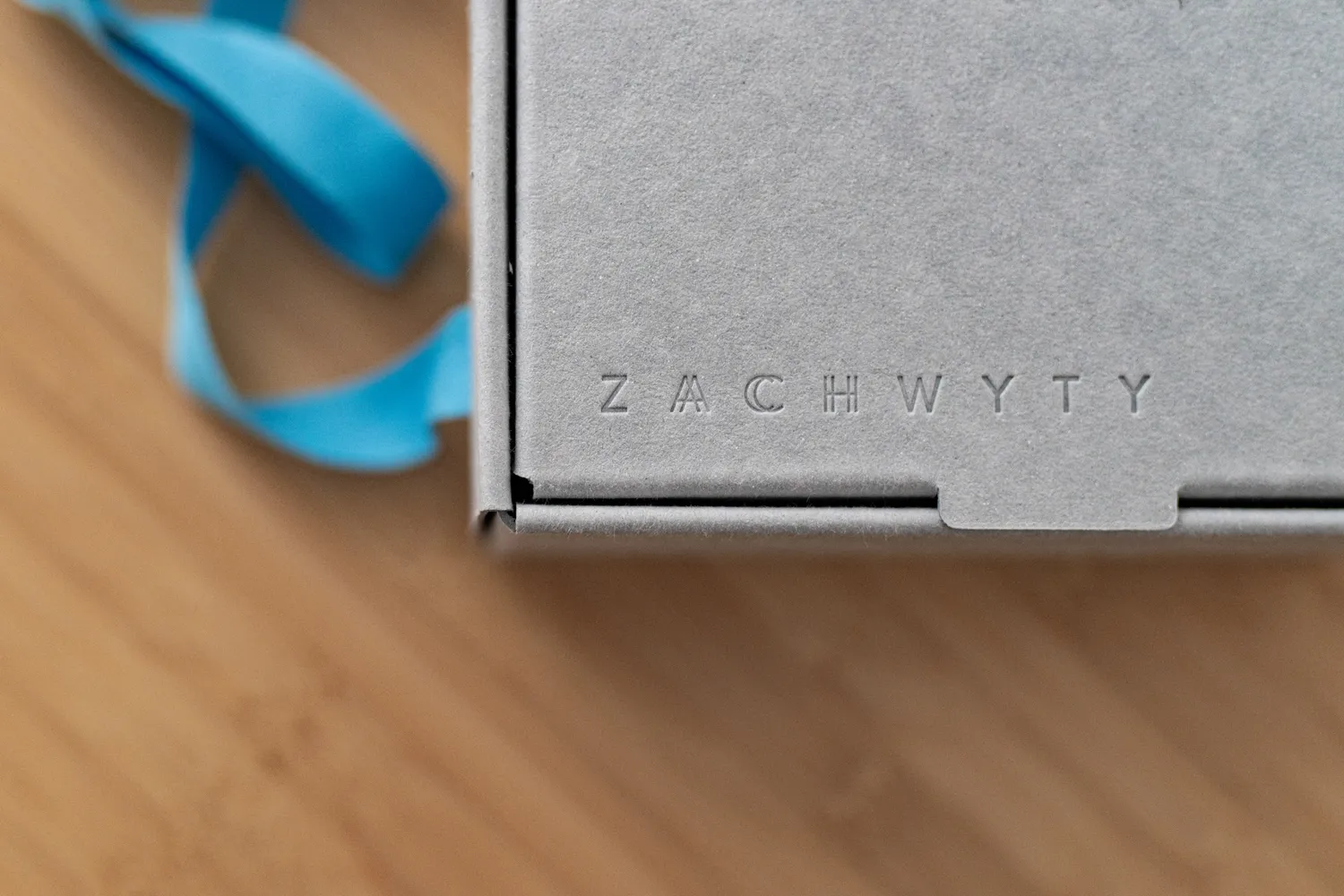 Nasze pudełko na wieku ma wytłoczony napis Zachwyty (które, mamy nadzieję, będą towarzyszyć przy wręczaniu tego upominku!) oraz granatowe uchwyty do przenoszenia – dzięki temu funkcjonalnemu rozwiązaniu nie potrzebujesz dodatkowych toreb prezentowych.