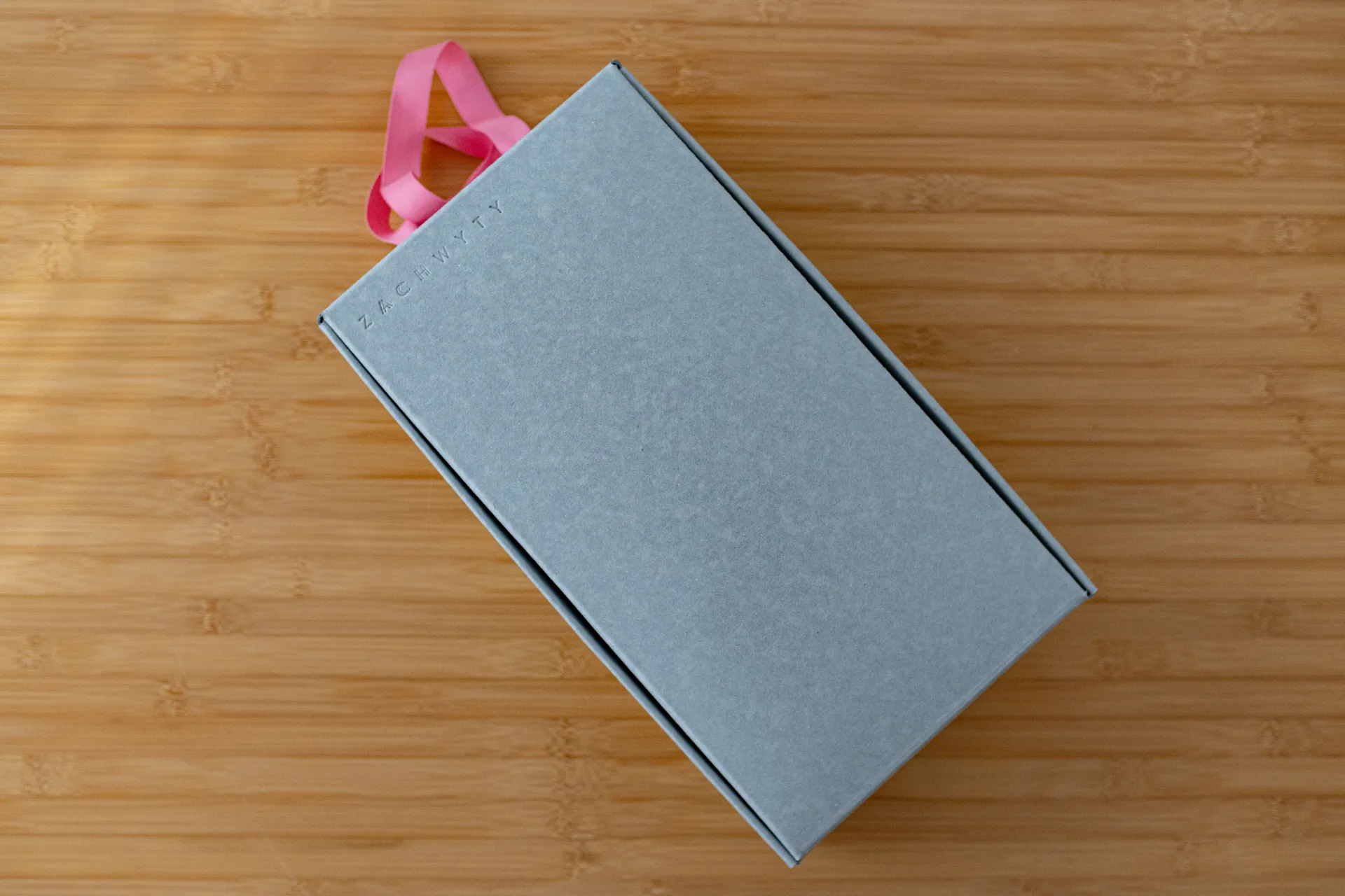 Upominek zapakowaliśmy w pudełko prezentowe wykonane z szarej tektury barwionej w masie, wykonanej z makulatury.