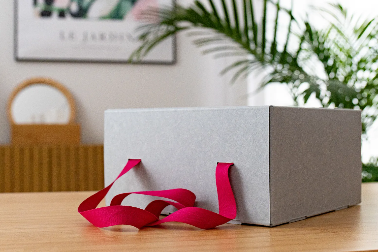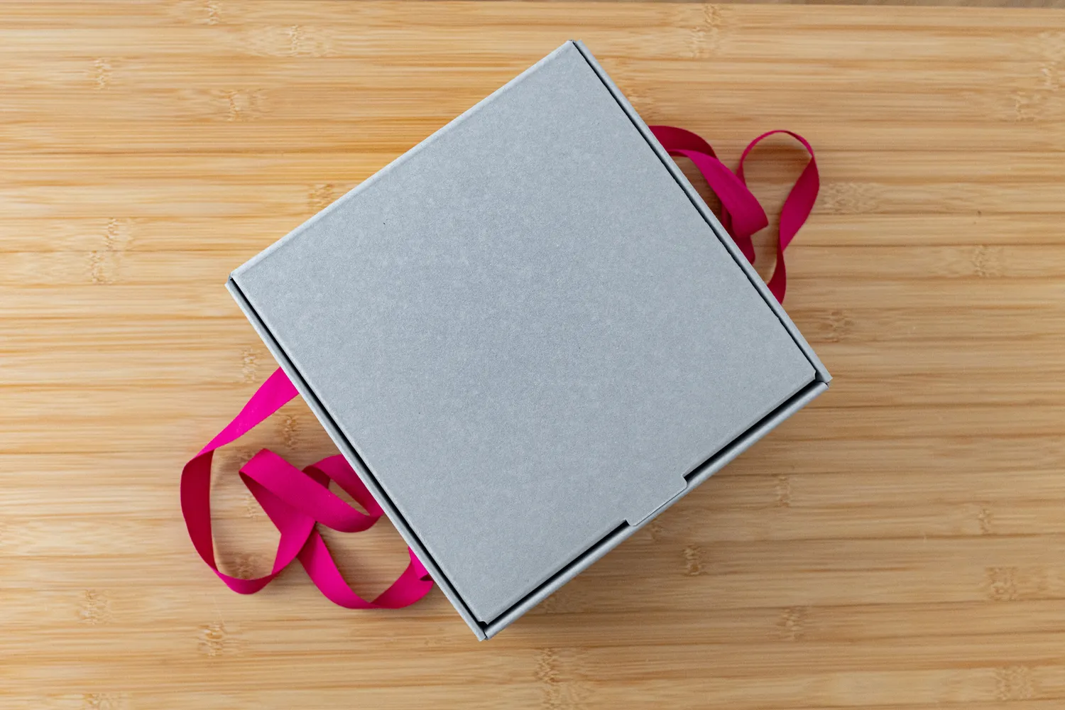 Upominek zapakowaliśmy w pudełko prezentowe wykonane z szarej tektury barwionej w masie, wykonanej z makulatury.
