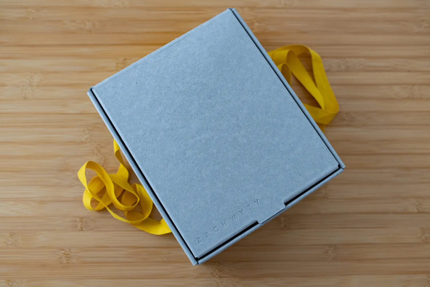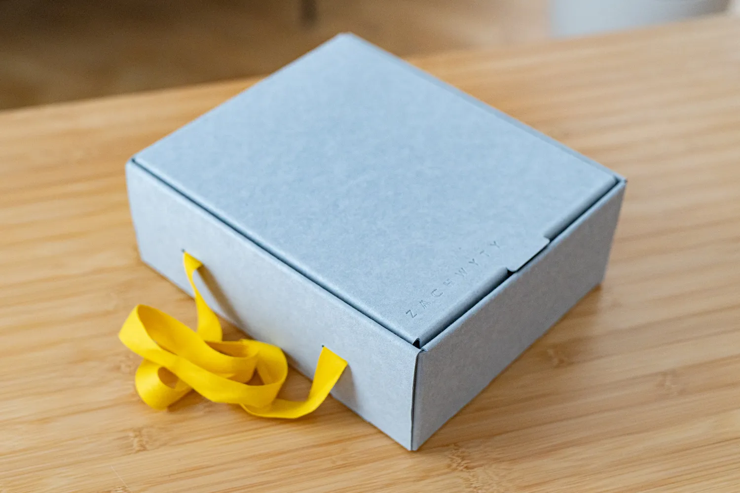 Upominek zapakowaliśmy w pudełko prezentowe wykonane z szarej tektury barwionej w masie, wykonanej z makulatury.