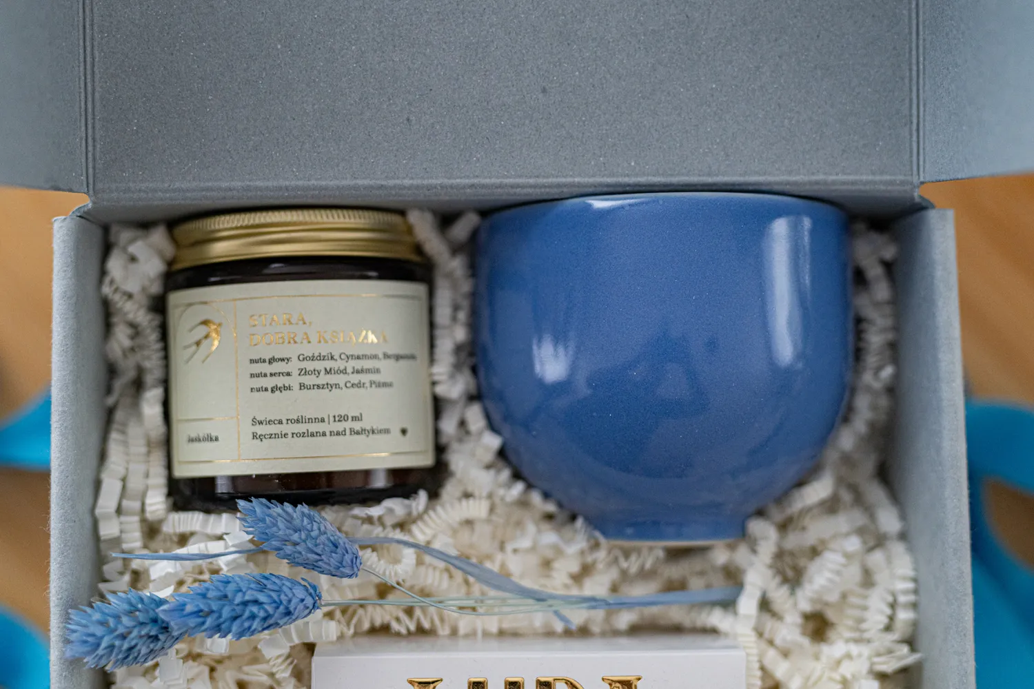 Wieczór z książką, czyli zapach antykwariatu zamknięty w sojowej świecy, pyszne zioła skomponowane w herbacie Zmierzch i czarka z małej polskiej manufaktury, o pięknym niebieskim odcieniu. Dla każdego, kto kocha wieczorne, spokojne chwile!